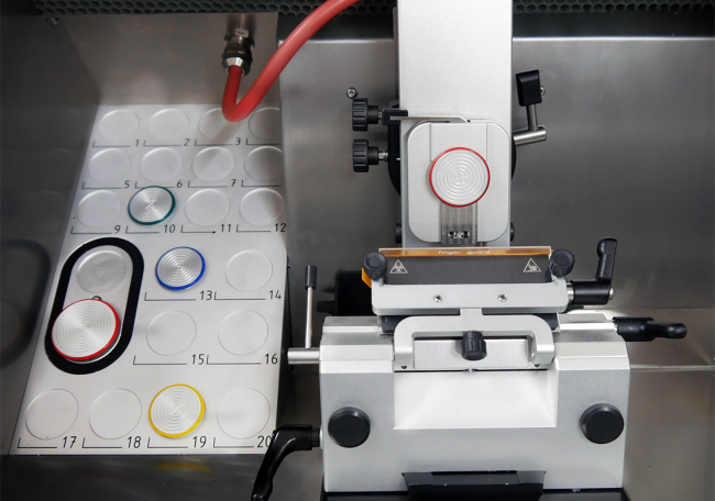 A fine adjustment mechanism is already integrated as standard with the specimen clamp holder. The specimen  clamp can be aligned horizontally and vertically and is characterized by its particular  stability. The blade holder can be  easily corrected using an angle mark. The blade clamp  is adjustable via grids in order to use  the blade precisely and to its full extent. It also has a manual guard.
